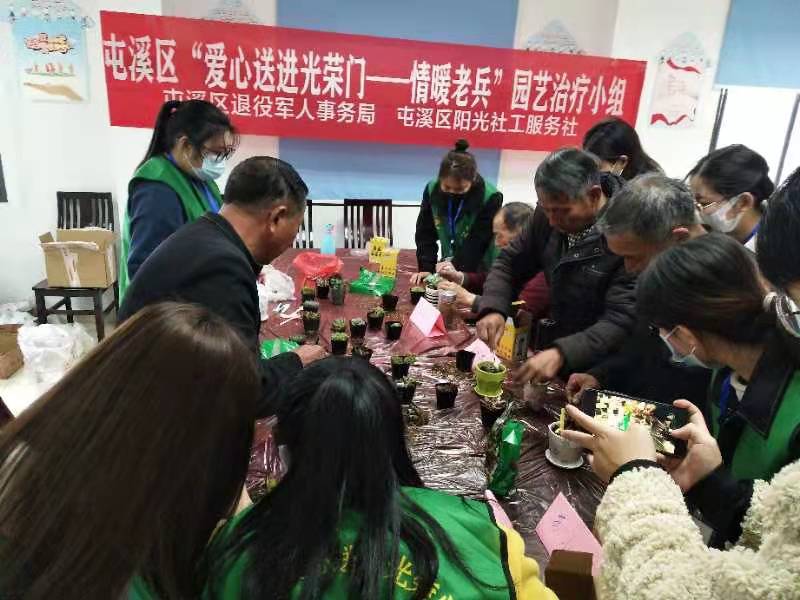学生第二党支部19公管党小组党员于11月下旬至12月中旬开展“一花一木一世界”志愿服务活动,为屯溪区退伍老兵提供生活帮助。在昱中阳光社工服务社的专业社工指导下,志愿者依次开展了“种植草娃娃”、“多肉种植”、“会开花的树”、“手工银杏花”、“圆木片绘画”等诸多丰富多彩的活动。老兵们也积极的向大家分享自己的种植经验,诉说着自己年轻时的故事。活动兼具专业性与趣味性,为老兵们带去美妙、欢愉时光。
