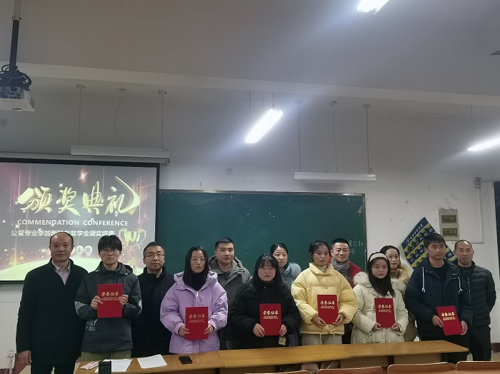 郭宏斌、张爱民、赵翠、方兴林、韩云超、江红给6位公共事业管理专业的获奖学生颁奖并合影。