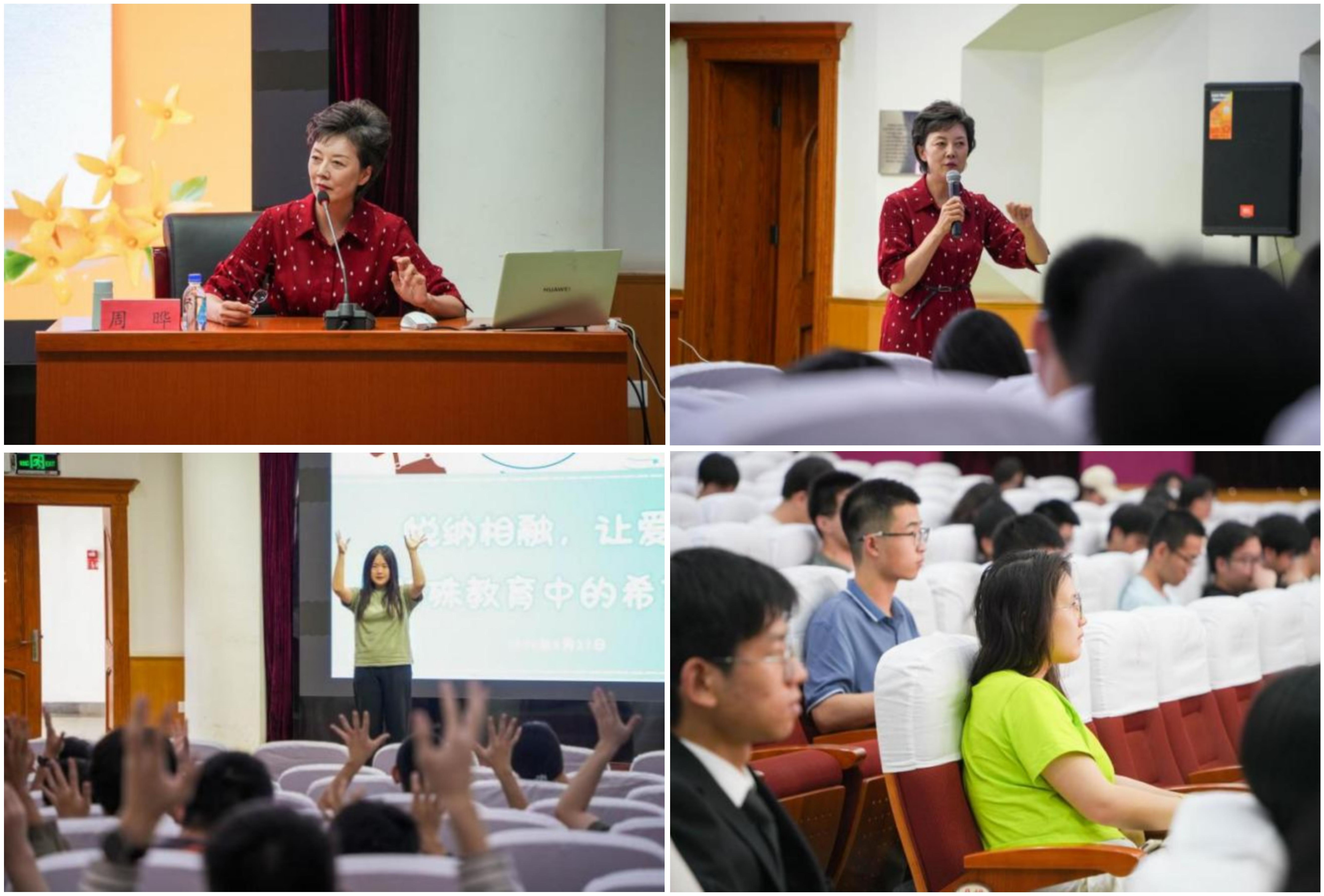 527下午电科院举办第六十二期格致论坛,邀请党的十七大代表、原北京市东城区特殊教育学校、培智中心学校党总支部书记兼校长周晔,“悦纳相融,让爱有声——特殊教育中的希望与信念”为主题做专题报告。周晔结合手语教学,分享从事特殊教育的亲身经历、深刻感悟以及特教群体的奋斗历程,呼吁大家对特殊群体给予更多关爱与支持用心传递大爱和温暖学院200名师生现场聆听报告
