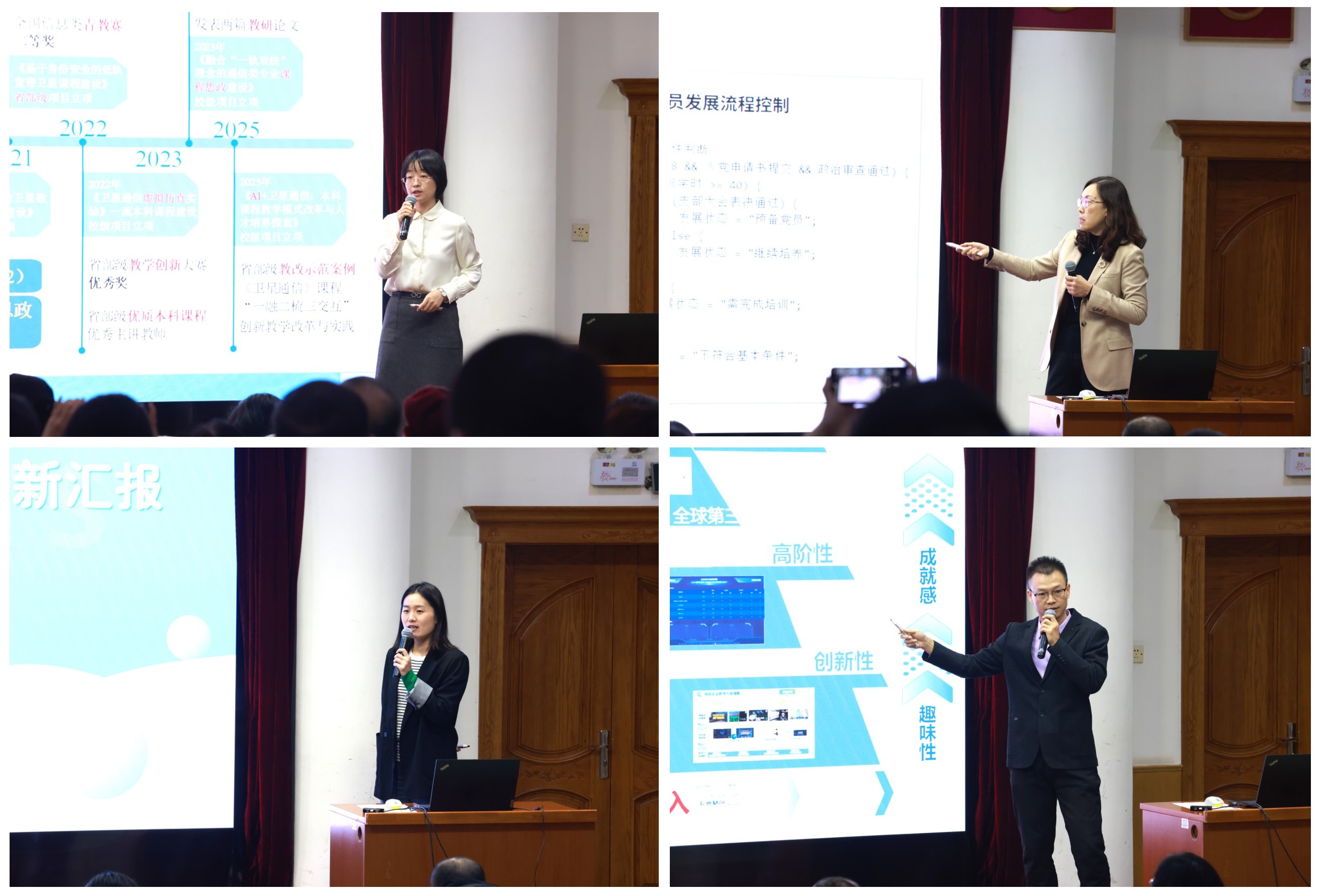 1024下午,学院举办教师教学创新大赛院赛院领导和教师代表120余人到场观摩。本次比赛分为“课程思政”、“新工科”、“新文科”、“基础课程”4个赛道,经各系部选拔推荐,共有8支教学团队参加不同赛道的院赛,院赛包括函评和现场汇报两个环节。在函评环节,5位校外专家对参赛团队的教学创新成果报告和教案进行打分。在现场汇报环节,参赛团队教师代表结合教学大纲与教学实践,进行不超10分钟的教学设计创新汇报,并接受校内外5位评委专家的打分。结合函评和现场汇报评分,郭超荣获一等奖,李艳、范洁荣获二等奖,赵越、刘宇栋荣获三等奖。