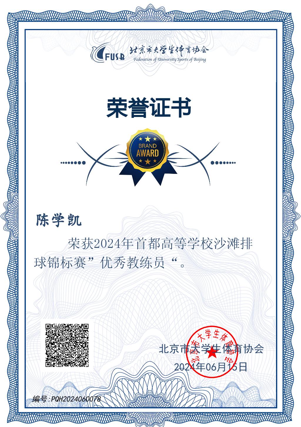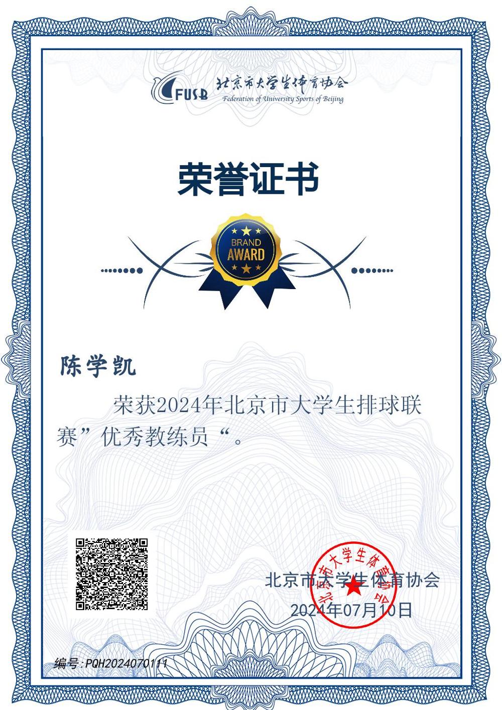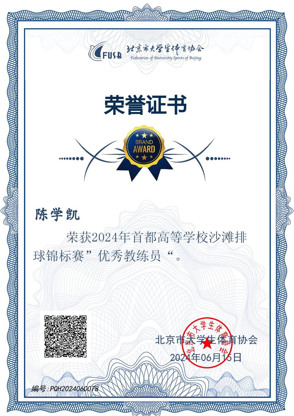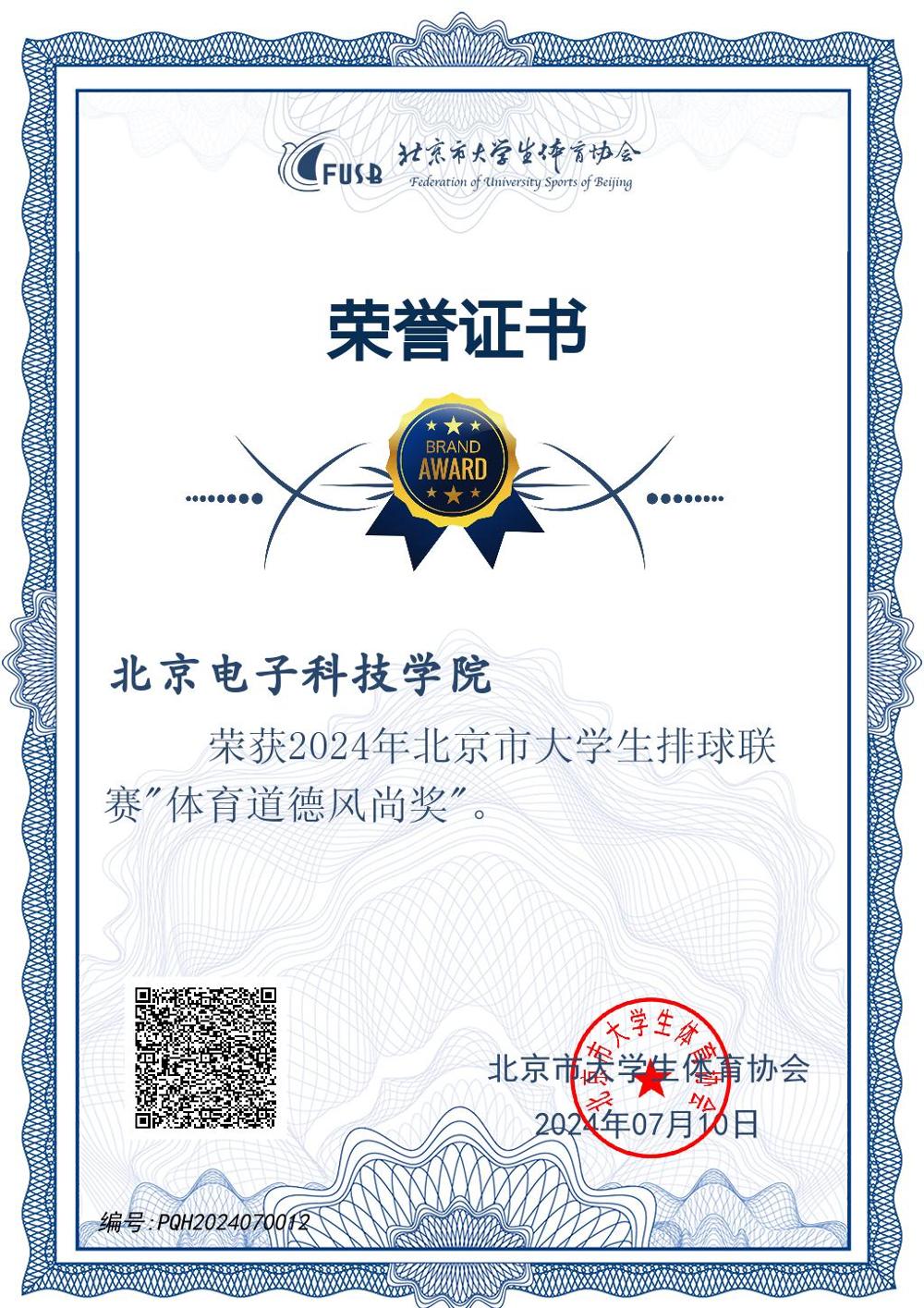 在2024年北京市大学生排球联赛中,BEAT365官网表现卓越,荣获“体育道德风尚奖”荣誉称号。陈学凯老师在2024年北京市大学生排球联赛和2024年首都高校沙滩排球锦标赛中表现出色,分别荣获“优秀教练员”称号。参赛运动员中有11人获得排球运动技能9级专业证书,7人获得8级专业证书。这些荣誉的取得不仅彰显了学院在排球运动领域对体育精神的积极倡导,也是学院推进“以体健人”校园体育文化建设的突出体现。此次获奖,是对BEAT365官网及老师在体育教育与竞赛中坚持体育精神与道德风尚的高度认可,将激励更多师生积极参与体育运动,为学院体育事业发展注入新动力。