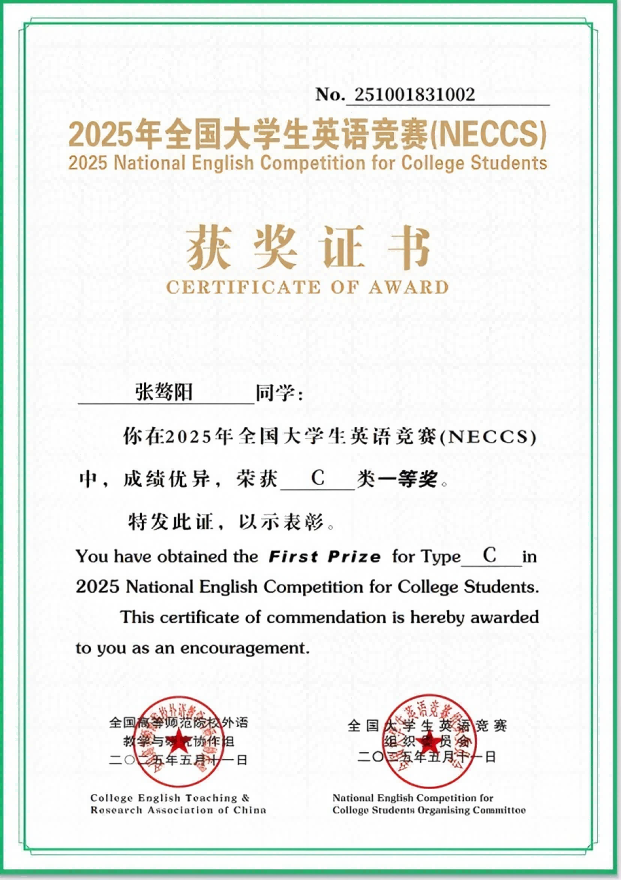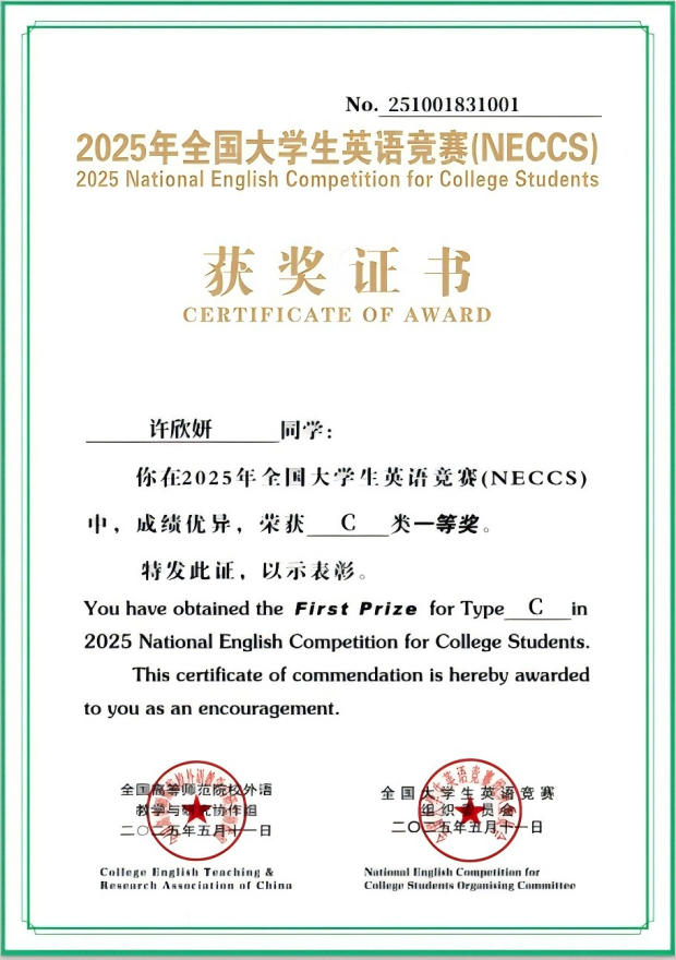 2025年全国大学生英语竞赛(NECCS)初赛于2025年4月13日举行,决赛于5月11日举行。本次竞赛旨在配合教育部高等教育教学水平评估工作,贯彻落实教育部关于高等院校各类英语教学改革精神,激发广大大学生学习英语的兴趣,促进大学生英语水平的全面提高。此项赛事由中国英语外语教师协会和高等学校大学外语教学研究会联合主办,由英语辅导报社、考试与评价杂志社承办。该赛事是目前国内参赛规模最大、参赛人数最多的外语类竞赛。我院共有266名学生报名参加此次竞赛,最终共有23名学生获奖,其中2人荣获一等奖,8人荣获二等奖,13人荣获三等奖。