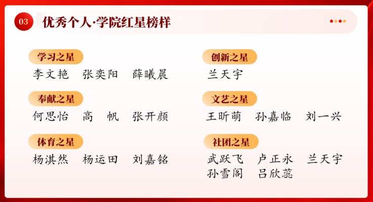 我们坚信学无止境,树立起比学赶超的优良学风。本次大会表彰了一批在专业学习、学科竞赛、理论学习等方面有突出成绩的管理系学子。他们在专业学习方面展现出了扎实的基础与不懈的钻研精神,凭借优异的学习成果和积极进取的态度,被授予“学习模范”的称号。