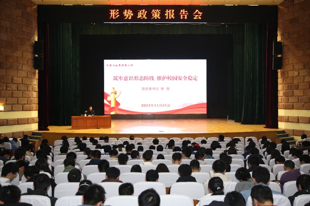 徐涛同志重点讲了意识形态工作是一项什么样的工作、当前高校意识形态领域面临什么样的风险挑战以及电科院学生应当怎样应对意识形态领域的风险挑战等三个问题。报告以习近平总书记关于意识形态工作的重要论述为根本遵循,从党的前途命运、国家长治久安和高校根本任务三个层次阐述了意识形态工作的极端重要性;立足高校这一意识形态工作的重要阵地,从六个方面分析了高校意识形态工作面临的风险挑战,阐明了做好高校意识形态工作的重要意义;结合学院政治属性和人才培养目标,提出了“强化政治意识、提高政治素养”“强化理论武装、筑牢理想根基”“不断巩固阵地、凝聚奋进力量”和“树立底线思维、敢于善于斗争”四个方面的要求,强化了同学们意识形态安全意识,明确了学院加强意识形态风险防范化解工作的举措,增强了同学们做守护校园意识形态安全“坚强卫士”的信心和决心。